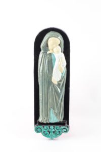 Jean FREOUR (1919-2010) Vierge à l’Enfant Plaque en faïence émaillée polychrome Signée au revers «J. Fréour» et numérotée «1/20» Dim. 50 x 16 cm