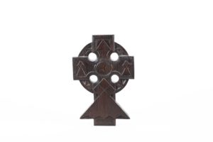 Rafig TULLOU (1909-1990) Croix celtique Chêne sculpté et patiné, vers 1945 Signée «Rafig Tullou» dans un cartouche à la base. Deux petits éclats à l’arrière. Haut. 25 cm x Long. 16,5 cm x Prof. 2 cm Bibliographie : - Daniel Le Couedic et Jean-Yves Veillard (dir.), Ar Seiz Breur 1923-1947, la création bretonne entre tradition et modernité , ed. Terre de Brume - musée de Bretagne, 2000 - René Trotel, «Le mobilier breton», éd. Coop Breizh, 2009