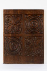 Rafig TULLOU (1909-1990) Panneau de boiserie Chêne massif sculpté à la gouge et au ciseau à bois, 1949. Usures Dim. 86 x 65 cm Bibliographie : - Daniel Le Couedic et Jean-Yves Veillard (dir.), Ar Seiz Breur 1923-1947, la création bretonne entre tradition et modernité , ed. Terre de Brume - musée de Bretagne, 2000 - René Trotel, «Le mobilier breton», éd. Coop Breizh, 2009
