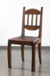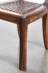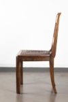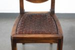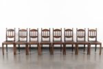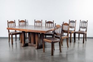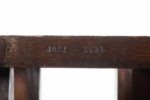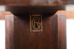 Jorj RUAL (1901-1986) Une importante table au piètement à entretoise en noyer massif à 4 colonnes moulurées encadrant une colonne centrale à pans coupés, le plateau en noyer et placage de loupe de noyer. Huit chaises en noyer massif, l’assise en lanières de cuir tressées (usures). La table porte la marque au fer à chaud «JORJ RUAL» et une plaque en laiton aux initiales «GR». Ateliers Rual, avenue du Mail, Rennes, vers 1935 Usures d’usage, manque les tenons de maintien du plateau. Table Haut. 74 cm x Long. 164 x Prof. 110cm Chaises Haut. 93 x Long. 44 x Prof. 42 cm Bibliographie : - Philippe Le Stum, «René-Yves Creston graveur sur bois et illustrateur» in Bernard-Jules Verlingue (dir.), «René-Yves Creston, du trait à la faïence» éd. musée de la faïence de Quimper, 2013 - Guillaume Kazerouni et Louis Deltour (dir.), «Rennes 1922», éd. musée des beaux-arts de Rennes, 2022 Très imprégné du style Arts & Crafts, cet ensemble illustre la transition de la maison Rual vers des styles plus modernes avec l’arrivée de Jorj Rual à la tête de l’entreprise familiale. Ebéniste et enseignant à l’école des beaux-arts de Rennes, Jorj Rual adhère à l’Unvaniez Ar Seiz Breur en 1932 et participe à l’aménagement du pavillon de la Bretagne lors de l’exposition universelle de 1937. Il prend la tête de l’atelier familial d’ébénisterie en 1935.