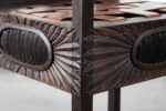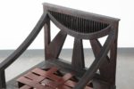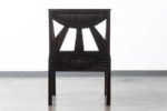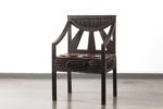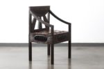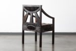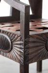 Jeanne MALIVEL (1895-1926) Exceptionnel fauteuil à décor rayonnant. Chêne teinté et lanières de cuir rapportées. Fauteuil réalisé par l’ébéniste et sculpteur Julien Bacon (1892-1980) Atelier Saint-Guénolé, Caurel, 1924 Petites usures Haut. 85 cm x Larg. 55 cm x Prof. 45 cm Dossier droit ajouré à décor sculpté d’un soleil rayonnant reposant sur une ceinture sculptée toutes faces de fleurs stylisées. La pente courbe et continue des accotoirs part des épaulements du dossier. Ces deux fauteuils, n° 148 et n° 149, issus d’une collection privée, ont été enduits d’une teinte plus sombre qu’à l’origine. Bibliographie : - Daniel Le Couédic et Jean-Yves Veillard (dir), Ar Seiz Breur 1923-1947, la création bretonne entre tradition et modernité , éd. Terre de Brume - musée de Bretagne, 2000 - Bernard-Jules Verlingue (dir), «Jeanne Malivel pionnière de l’art moderne breton», éd. Amis du musée & de la faïence de Quimper, 2018 - Olivier Levasseur «Jeanne Malivel, une artiste engagée», éd. Locus Solus, 2023 Particulièrement graphiques, ces fauteuils tirent leur puissance esthétique du décor «rayonnant» du dossier qui symbolise le soleil, dont les rayons ajourés inondent de lumière les fleurs sculptées sur la ceinture : ces fauteuils sont d’abord un hymne à la vie. On peut de plus y déceler «l’awen» druidique, symbole d’énergie vitale et porte-bonheur. A l’origine ces fauteuils ont en effet été dessinés en 1919 par Jeanne Malivel pour le mariage de sa soeur Marie-Charlotte : ils portent les voeux de bonheur de sa créatrice, de même qu’ils restituent la vitalité de cette pionnière des arts décoratifs, alors âgée de 24 ans. Il convient enfin de noter une particularité de fabrication de ces fauteuils réalisés par Julien Bacon à l’atelier Saint Guénolé de Caurel (Côtes-d’Armor). Ils sont d’abord entièrement montés puis sculptés à même la structure, sans possibilité de repentir. Ce type de fabrication, rare dans l’ébénisterie moderne, leur confère un double statut : celui de mobilier et celui de véritable sculpture. Note du Comité Scientifique : La création de ces fauteuils en 1919 constitue un jalon important dans la genèse du mouvement moderne en Bretagne : on peut qualifier leur design de «pré-Seiz Breur». Philippe Bonnet