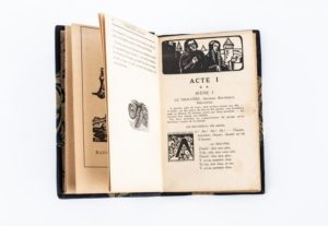 André LE MARCHAND Raoul de Fougères, ou l’Héroïque rançon. IIllustrations de Jeanne Malivel Rennes, Imprimerie Oberthür, 1923. 1 vol. in-12, 136 pp. Reliure en pleine basane bleue à coins, dos à nerfs orné d’une hermine dorée, auteur et titre dorés Edition originale de ce drame historique en trois actes, orné de seize bois originaux gravés par Jeanne Malivel : deux hors-texte (dont le frontispice), une vignette de titre, deux bandeaux, trois en-têtes, trois lettrines et cinq culs-de-lampe Exemplaire court de tête. Petites déchirures marginales par endroits Dim. 18 x 12 cm