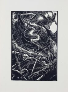 René-Yves CRESTON (1898-1964) Les corsaires Gravure sur bois sur papier «Mécanographie Guérinand Voiron» monogrammée dans la planche. Petites taches dans la marge. Dim. 43,5 x 32,5 cm