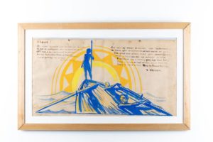 René-Yves CRESTON (1898-1964) Gouache préparatoire à «Kan da Gornog» Importante gouache sur papier contrecollé Signée «R.Y. Creston» en bas à gauche Tampons d’exposition au dos Pliures, usures et déchirures Dim. à vue 44 x 84 cm Reprenant de nouveau les vers d’un passage du poème épique «KAN DA KORNOG» de Youenn Drezen, R.Y. Creston figure dans cette grande gouache une traversée à bord d’un navire par les celtes, magnifiant l’effort des rameurs. L’un des leurs; à la proue; fait face au soleil couchant qui les mènera vers la terre de Bretagne. Cette oeuvre a été présentée lors de l’exposition Ar Seiz Breur 1923-1947, la création bretonne entre tradition et modernité au musée de Bretagne à Rennes en 2000. Provenance : ancienne collection Youenn Drezen