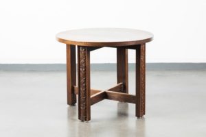 Joseph SAVINA (1901-1983) Guéridon Chêne ciré Quatre pieds décorés de feuillage en réserve et réunis par une entretoise et supportant un plateau circulaire. Atelier d'Art Celtique, vers 1955 Petites usures et usures d’usage Haut. 55 cm Diam. 70 cm