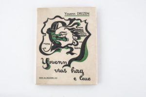 Youenn DREZEN (1899-1972) Youenn vras hag e leue. Pemp pezh-c'hoari - 5 pièces de théâtre, avec chacune des illustrations hors-texte par Bourlaouen, Jos Kervella, R-Y Creston, X. de Langlais, Per Péron. 1 vol in-4 (25x19,5cm) br., couv. illustrée, 164 p. Ed. Skrid Ha Skeudenn, Nantes, 1947 Exemplaire numéroté (282x1200) et dédicacé par l'auteur à Auguste Coïc.