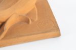 Mathurin MEHEUT (1882-1958) Le Porteur de Raies Important sujet en terre cuite patinée Signé du monogramme «MM» à la base Manufacture Henriot Quimper, vers 1928 Petits éclats Haut. 43 cm Long. 39 cm Prof. 14 cm Rare tirage en terre cuite patinée de cette emblématique sculpture du marin porteur de raies faisant pendant de la paimpolaise tirant des aiguillats ou « chiens de mer ». Le Musée Yvonne Jean-Haffen de Dinan conserve un tirage similaire dans ses collections. Nous remercions M. Bernard-Jules Verlingue et M. Gilles Baratte pour leurs informations. Bibliographie : - Bernard-Jules Verlingue, «Mathurin et Maryvonne Méheut», éd. association des amis du musée de la faïence de Quimper, 2003