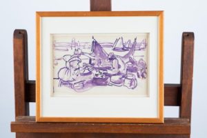 MEHEUT Mathurin, 1882-1958 Scène de retour de pêche lavis d'encre violette (traces de plis et légère insolation sur les bords), monogramme en bas à droite à la mine de plomb 14,5 x 23,5 cm. Expert : Michel MAKET