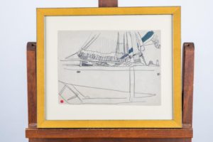 MEHEUT Mathurin, 1882-1958 Voilier sur béquille mine de plomb avec rehauts de gouache (traces de plis et petites taches), en bas à gauche petite étiquette rouge n°204 20x28 cm à vue. Expert : Michel MAKET