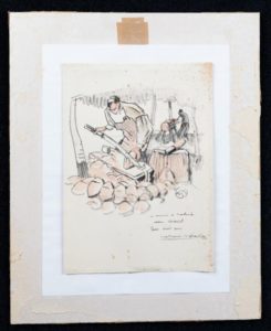 MEHEUT Mathurin, 1882-1958 Les sabotiers lavis d'encre noire et aquarelle (rousseurs), signé en bas à droite avec une dédicace à Monsieur et Madame Jean Bréard , monogramme en bas à droite 33,5x24 cm. Il existe un bois gravé du même sujet daté 1926. Expert : Michel MAKET