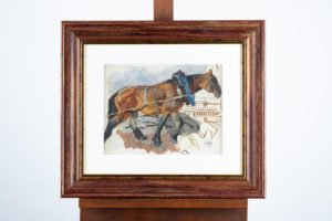 MEHEUT Mathurin, 1882-1958 L'effort du cheval huile et aquarelle sur papier (petites taches et traces de plis), monogramme en bas à droite, porte le cachet du Musée de Lamballe 24x32 cm à vue. Bibliographie : Patrick Jude, Regards sur Mathurin Méheut, Editions Ouest France, 2010, décrit et reproduit en couleurs. Expert : Michel MAKET