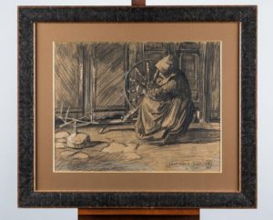 MEHEUT Mathurin, 1882-1958 Fileuse bretonne, Côte du Nord, La poterie, crayon noir et rehauts à la craie blanche sur papier (traces de jaunissement et quelques rousseurs), en bas à droite : monogramme, titre et situation à la mine de plomb 48x62,5 cm à vue. Expert : Michel MAKET