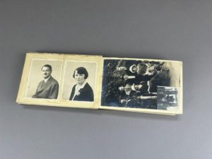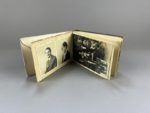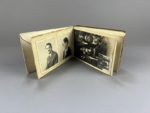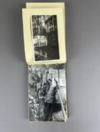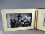 Mathurin MEHEUT (1882-1958) Petit album de photographies de famille Environ 40 photographies des années 1925 dont : Méheut dans son atelier, Méheut avec ses plâtres, la maison Alleray Cet album devait appartenir à M. et Mme Chaumier. 14 x 9.5 cm Cet album de photos est accompagné d’une liste manuscrite de noms. On ne sait qui a établi cette liste. Y figure le nom de Chaumier, des amis roscovites de Méheut qui avaient accueilli la famille Méheut chez eux lors de son séjour à Roscoff en 1910-1912. Une gouache « La part du pauvre, Douarnenez », porte une dédicace : « Vive la saint Louis, vive la sainte Jeanne, à mes chers amis Chaumier, leur vieux copain Méheut avec ses voeux bien sincères, Paris août 1947 » (page 68 du livre Mathurin Méheut, Denise Delouche, Anne de Stoop, Patrick Le Tiec, Chasse-Marée, 2004). On connaît également des courriers de Méheut aux Chaumier, ainsi qu’une belle dédicace dans un exemplaire du livre Regarde : « A Madame Chaumier, en souvenir de toutes ses gentillesses et en souvenir de son beau pays de Roscoff où j’ai trouvé du reste les matériaux de cette modeste plaquette ». L’album a-t-il appartenu aux Chaumier ? C’est une hypothèse vraisemblable. Cet album contient de nombreuses photos d’inconnus. Six concernent Méheut et sa famille. Une photo en buste est celle de la fille de Méheut, Maryvonne, âgée environ de vingt ans, très semblable à l’autochrome réalisée à Boulogne en 1931 par l’opérateur Georges Chevalier. Une photo de l’épouse de Méheut, Marguerite, robe à fleurs et collier : voir la ressemblance avec le portrait que Méheut fait en 1917, : Marguerite lisant (page 226 du livre cité). Au dos figure la mention manuscrite : « Marguerite Méheut, photo noir et blanc tirée d’après l’autochrome prise par Roger Dumas - Réception chez Albert Kahn à Boulogne le 9 sept. 1930 ». Cette photographie est reproduite p. 117 du livre « Mathurin Méheut, Richesse et Diversité, Patrick Jude, Ouest-France, 1997). L’entrée de la maison de Méheut rue d’Alleray à Paris. Derrière le portail marqué du « MM », on reconnaît à droite Maryvonne Méheut. Au dos figure la mention manuscrite : « Maison de Mathurin Méheut. Portail - céramiques gazelle bondissante - volutes ». La photo en buste de Méheut à la manufacture de Sèvres, entre quatre pièces : à gauche « Les hippocampes», « Poissons d’Hawaï », « Calmar et congres », et à droite « Seiches et poissons ». Ces pièces figuraient dans l’exposition de Méheut à la Galerie Charpentier en décembre 1928, et sont reproduites dans diverses revues d’art de l’époque, notamment dans L’Art et les Artistes (11/28), La Renaissance de l’art (12/28), ABC artistique et littéraire (01/29). Au dos une mention manuscrite : « Mathurin Méheut dans son atelier avec des projets de céramique - oeuvre à gauche « algues et hippocampes » - à droite « banc de poissons effrayé par un calmar ». Cette photo figure dans le livre cité, p. 314. La photo inédite de Méheut posant debout dans son atelier, devant des tableaux, est très proche d’une autre photo (page 45 du livre cité), faite sans doute au même moment : Méheut porte la même veste à deux poches, le même pantalon rayé ; cigarette à la bouche dans un cliché, cigarette à la main dans l’autre. Le photographe souhaitant montrer plus d’oeuvres a probablement demandé à l’artiste de se déplacer dans l’atelier : les deux clichés ont semblent ils été faits à suivre. Si dans la photo déjà connue figurent deux oeuvres monumentales exposées en 1921 au Pavillon de Marsan « L’Automne, le pardon de Notre-Dame de la Joie » et « Le printemps les sardiniers », les tableaux ont été ici plus difficiles à identifier. On reconnait « Les chevaux de bois » un panneau décoratif exposé au pavillon de Marsan en 1921 et « Les binious », une oeuvre également exposée en 1921, qui sera donnée en 1972 par la famille de l’artiste au musée de Lamballe. Elle a été restaurée récemment et est actuellement présentée au nouveau musée Mathurin Méheut. Deux paysages de forêt en bas à droite se rapportent à son travail pour l’illustration du livre Etude de la forêt de Lucien Plantefol, paru en 1927. Deux dessins d’ours blancs pourraient être mis en relation avec deux lettres adressées à Yvonne Jean-Haffen en 1927 et 1928 (LM155 et LM224) et également avec un dessin de la donation Château-Grall daté 1942 (catalogue Mathurin Méheut donation Chateau-Grall, musée de Bretagne, 2001). Les autres tableaux restent mystérieux, comme à droite des esquisses d’animaux (homard, serpent, singe). Sur la photo de deux couples, devant le château de Pierrefonds dans l’Oise : on reconnait à gauche Méheut aux côtés d’une inconnue et à droite son épouse Marguerite aux côtés d’un inconnu (ces inconnus pourraient être madame et monsieur Chaumier). Au dos, figure la mention manuscrite : « Mathurin Méheut à gauche ». Dans les lettres adressées à Yvonne Jean-Haffen, deux ont pour sujet le château de Pierrefonds (lettres 66B et 67B, datables de 1933).