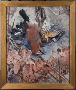 MEHEUT Mathurin, 1882-1958 Geai et grive aux fougères peinture à la caséine sur panneau préparé à l'enduit, monogramme en bas à gauche 70,5x58 cm. Historique : Mathurin Méheut a réalisé en 1927 des illustration pour Raboliot, le braconnier solognot du roman de Maurice Genevoix.