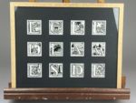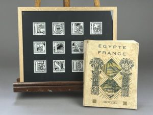 Mathurin MEHEUT (1882-1958) Suite de douze dessins Encre de chine sur papier Créés pour illustrer sous forme de lettres ornées le catalogue de l’exposition «Egypte-France» au Caire en 1929 On y joint le catalogue de l’exposition Dim. avec cadre 34 x 41 cm