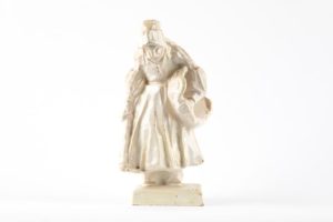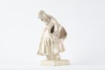 Georges GEO-FOURRIER (1898-1966) La ramasseuse de pommes de terre Sujet en faïence émaillée en blanc Manufacture Henriot Quimper, vers 1930 Petits éclats et sauts d'émail Haut. 22,5cm Larg. 10,5 cm Prof. 10,5 cm Cette vieille bretonne voutée portant sa houe et son grand panier est un grand classique de la production quimpéroise de Géo-Fourrier, ce tirage, ne portant aucune signature, en est probablement l'un des tout premier.