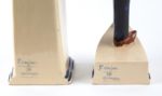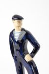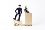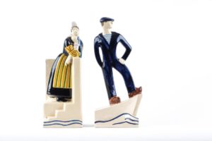 François CAUJAN (1902-1945) Couple de bretons Deux sujets formant serre-livres Faïence émaillée polychrome Manufacture HB Quimper, vers 1930 Chaque pièce signée au bas "F. Caujan" et "HB Quimper". La bigoudène : Haut. 26 cm - Larg. 9.5 cm - Prof. 10.5 cm Le marin : Haut. 26 cm - Larg. 11.5 cm - Prof. 9.5 cm