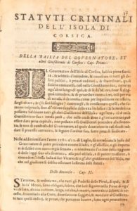 [STATUTI CIVILI ET CRIMINALI DELL’ISOLA DI CORSICA. In Bastia, per Francesco Maria Martini, …