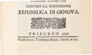 [GIUSTINIANI (Pier-Maria)]. Risposta ad un libello famoso intitolato Disinganno intorno alla guerra di Corsica. Friburgo [en Suisse], presso Innoc[ento] Teodorico Hautt, 1737. Petit in-8, 271-(une blanche) pp., parchemin rigide, dos à nerfs avec titre à l’encre, tranches mouchetées ; restauration ancienne au dos (reliure de l’époque). ÉDITION ORIGINALE DE CE PAMPHLET FAVORABLE AUX DROITS DE GENES SUR LA CORSE. Il répond au Disinganno de Giulio Natali que ce dernier, sous le pseudonyme de Curzio Tullian, avait publié en 1736 en faveur des Corses révoltés. L’évêque de Sagone Pier-Maria Giustiniani s’attache à porter ainsi une critique systématique à l’encontre de la rébellion, dans les faits et dans ses principes, s’appuyant sur saint Paul et Bossuet pour prôner l’obéissance au pouvoir temporel. Au passage, il prend la défense des évêques génois de Corse violemment pris à partie dans le Disinganno. Provenance : le Père dominicain Giovanni-Benedetto Zuanelli (vers 1669-1738, ex-libris manuscrit au titre). D’origine vénitienne, professeur de philosophie et de théologie, il fut régent de l’Université de Padoue, second bibliothécaire (1706-1711) puis préfet de la Biblioteca Casanatense des Dominicains à Rome de 1711 à 1728, et enfin Maître du Sacré Palais apostolique, c’est-à-dire théologien attitré du Palais pontifical (1728-1738). – Xavier Versini (double ex-libris, soit sa signature p. 11 et ses initiales p. 26). Sur Pier-Maria Giustiniani, voir ci-dessus le n° 3. Provenance : Xavier Versini (double ex-libris, soit sa signature p. 11 et ses initiales p. 26).