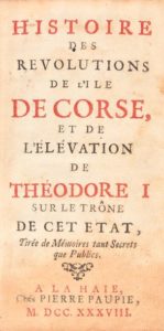 [WITTELIEB (Jacob von)]. – HISTOIRE DES REVOLUTIONS DE L’ILE DE CORSE, et de l’élévation de Théodore I sur le trône de cet État. À La Haie, chés Pierre Paupie, 1738. Petit in-12,(12)-323-(1) pp., basane brune marbrée, dos lisse orné de motifs dorés en répétitions, coupes ornées, tranches rouges ; sans le frontispice gravé sur cuivre, reliure usagée avec coiffe inférieure restaurée, mors supérieur entièrement fendu, départ du mort inférieur fendu (reliure de l’époque). ÉDITION ORIGINALE. L’ouvrage comprend deux parties distinctes. La première est un abrégé de l’Istoria di Corsica d’Anton-Pietro Filippini (1594), rédigé dans une langue élégante, qui fut parfois attribué à l’écrivain Jean-Baptiste Boyer d’Argens, auteur notamment des Lettres juives parues chez Pierre Paupie en 1736-1737, ouvrage mentionné deux fois dans le présent volume, dans l’avertissement du libraire et dans la préface. La seconde partie, écrite dans une langue sans artifice, plus informative, est attribuée à Jacob von Wittelieb par Renée Luciani, qui suivait en cela l’avis de Charles de Giafferi. C’est le récit du début de l’aventure de Theodor von Neuhoff, noble westphalien élu roi de Corse en 1736, et de sa lutte contre les Génois avant le débarquement français qui mettrait un terme à cette première tentative d’indépendance corse. L’ouvrage ferait l’objet d’une traduction italienne en 1739. Provenance : Xavier Versini (double ex-libris, soit sa signature p. 11 et ses initiales p. 26).