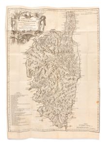 JAUSSIN (Louis-Armand). Mémoires historiques, militaires et politiques, sur les principaux événemens arrivés dans l’isle & royaume de Corse, depuis le commencement de l’année 1738 jusques à la fin de l’année 1741. À Lausanne, chez Marc-Mic[hel] Bousquet & comp. 1758. 2 volumes in-12, xxx-591-(une blanche) + (2 dont la seconde blanche)-604 pp., basane brune marbrée, dos à nerfs cloisonnés et fleuronnés avec pièces de titre grenat, filet simple estampé à froid encadrant les plats, coupes filetées, tranches marbrées ; un départ de mors entamé, coins un peu frottés, étiquette de papier en queue des dos, léger disparate dans la teinte des pièces aux dos, mouillures marginales aux derniers feuillets du premier volume (reliure de l’époque). ÉDITION ORIGINALE. GRANDE CARTE DE CORSE GRAVEE SUR CUIVRE (50 x 44 cm), établie par le géographe Gilles Robert de Vaugondy, d’après le relevé effectué sur place en 1740 par l’ingénieur Jean Bourcet de La Saigne sur ordre du futur maréchal de Maillebois qui commandait l’intervention française dans l’île. APOTHICAIRE MILITAIRE DEBARQUE EN CORSE AVEC LES TROUPES FRANÇAISES EN 1738, LOUIS-ARMAND JAUSSIN conduit d’abord un récit détaillé de son voyage jusqu’à l’île, et, après quelques remarques succinctes sur l’histoire passée de la Corse, relate en détail l’intervention française menée sous les ordres du comte de Boissieux puis de Maillebois – il livre à l’appui de ce récit les copies de diverses preuves. Il achève son ouvrage par des observations personnelles sur l’histoire naturelle de l’île. Petit-fils du célèbre apothicaire Jacques Dalibour, apothicaire lui-même reçu maître à Paris en 1732, il fit un temps une carrière militaire, accompagna l’armée français en Italie en 1733, fut nommé apothicaire-major des camps et armées du roi en 1737, et servit donc en Corse, puis en Bavière, en Bohème et dans le Palatinat. Il exerçait à nouveau son métier dans le civil à Paris au début des années 1760. Provenance : le duc Gaspard-Louis-Aimé de Clermont-Tonnerre (1812-1889, ex-libris armorié gravé de sa bibliothèque au château Ancy-le-Franc, dans l’Yonne). – Xavier Versini (triple ex-libris, soit sa signature sur le titre du premier volume et p. 11 des 2 volumes, puis ses initiales p. 26 des 2 volumes).