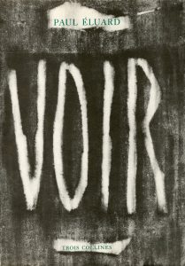 Voir. Poèmes. Peintures. Dessins. Genève-P., Trois Collines, 1948, in-folio (34,5 x 24,5 cm), cart. souple d'édit., jaq. illustrée par Raoul Ubac (petit manque aux rabats). Edit. orig. Ex. num. sur grand vélin blanc (celui-ci non num.). Poèmes de Paul Eluard en hommage à Picasso, Man Ray, Chagall, Delvaux, Magritte, Miro, Tanguy, Dali, Dubuffet, Fautrier, Ernst, et quelques autres. Les poèmes sont accompagnés de reproductions en noir et en couleurs de ces mêmes artistes.