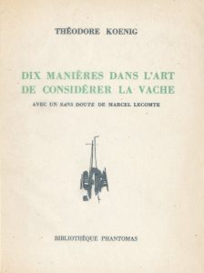 Dix manières dans l'art de considérer la vache. Avec un sans doute de Marcel Lecomte. Brux., "Bibl. Phantomas", s.d. (ca 1954), plaquette in-12, br. Edit. orig. Envoi : "Cordialement au poète Claude Haeffely qui, que... T. Koenig, le 3.6.59".