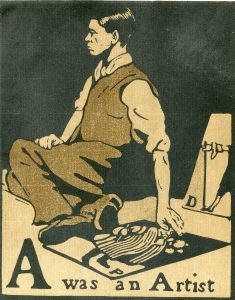 An Alphabet. London, William Heinemann, 1898, in-folio (41 x 33 cm), planches interfoliées par des feuillets bruns, toile illustrée édit. (déchirure en tête de dos). Bien complet des 26 bois originaux en couleurs de Nicholson. Edit. orig.