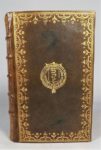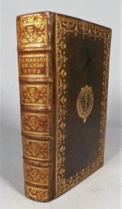 ALMANACH DE LA VILLE DE LYON, et des provinces de lyonnois, forez, et beaujolois ; avec la notice des paroisses du diocèse. Pour l'année bissextile 1772. Lyon, Aimé de La Roche, 1772. In-8, maroquin olive, large dentelle fleurie et filets dorés encadrant les plats, armes dorées au centre, dos à nerfs très orné, tranches dorées (reliure de l'époque). Edition originale. Bon exemplaire. Provenance : Exemplaire aux armes de la famille Colbert, apposées postérieurement. Bibliothèque B. D. Neviller (ex-libris).