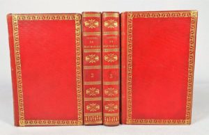 BEAUMARCHAIS (Caron de). OEuvres Choisies. Paris, Ménard et Desenne, 1818. 4 volumes in-12, maroquin groseille à long grain, large roulette dorée encadrant les plats, dos à nerfs ornés, tranches dorées (reliure de l'époque). Frontispice et 6 planches gravées par Simonet, Manceau. Rousseurs éparses, sinon bel exemplaire. Provenance : Bibliothèque A. Perreau (ex-libris).