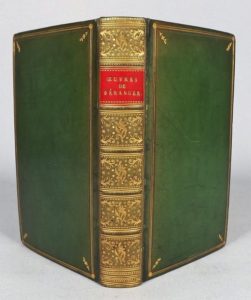 BERANGER (Pierre-Jean de). OEuvres complètes. Paris, chez tous les libraires, 1847. In-12, veau émeraude, filets et fleurons dorés sur les plats, dos à nerfs orné, tranches dorées (Bound by Mansell). Selon Jules Brivois cette édition serait une contrefaçon. Nombreuses vignettes. Très bon exemplaire (Brivois, bibliographie de l'oeuvre de P.J. Béranger, p. 79) Provenance : Ex musaeo Isaaci Currie (ex-libris).