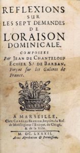 CHANTELOUP (Jean de). Réflexions sur les sept demandes de l'oraison dominicale. Marseille, Ch. Brebion, 1682. In-16, basane brune, dos très orné, étui moderne (reliure de l'époque). E.O. Par Jean de Chanteloup, écuyer, Sieur de Barban, forçat sur les galères de Marseille. Frontispice gravé, réparation au titre, le dos est joliment orné.