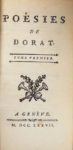 DORAT. Poésies. Genève, s.n. (Cazin), 1777. 4 volumes in-16, maroquin rouge, filets dorés sur les plats, dos lisse finement orné, tranches dorées (reliure de l'époque). Portrait de l'auteur en médaillon d'après Denon, gravé par De Launay. Charnières un peu craquelées. Exemplaire en maroquin de l'époque joliment relié. Provenance : Des bibliothèques Albert Pascal (ex-libris gravé) et de la famille Jeannin (tampon sec aux armes et avec la devise « vulneratum sed remuneratum »).