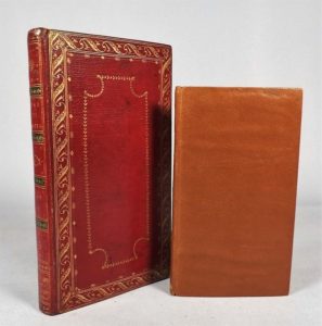 ÉTAT GENERAL ET CARTE GEOMETRIQUE des routes de la République Française, desservies en poste, avec désignation des relais et des distances, Paris, Favre, an IX. In-8, maroquin rouge, double encadrement doré sur les plats, large dentelle intérieure, doublures et gardes de moire verte, dos lisse très orné, tranches dorées (reliure de l'époque). Édition avec le texte encadré. Rousseurs, carte manquante. On joint : VOYER DE PAULMY (Marc Pierre de). Liste générale des postes de France. Paris, Jaillot, 1755. In-12, chagrin fauve, dos lisse (reliure moderne). Rousseurs, carte manquante. Ensemble 2 volumes.