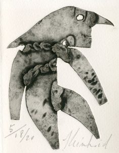 Reinhoud. Entre le marteau et l'enclume. Brux., Le Salon d'Art, 1982, petit in-12, br. Édition originale tirée à 50 ex. num. 1/20 ex. de tête comprenant une gravure originale de Reinhoud justifiée et signée au crayon par l'artiste. Signatures de Reinhoud et de L. de Heusch en dessous de la justification. Probablement une des premières gravures de Reinhoud, car c'est en 1982 qu'il commença à réaliser des gravures sous l'influence de Pol Bury.