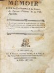 (Pêcheurs de Marseille). Mémoire pour les prud'hommes de la communauté des Patrons-Pêcheurs de la ville de Marseille. Marseille, chez F. Brebion, 1787. In-4° de [2]-146-44 pages, basane, dos orné (reliure de l'époque). La dernière partie concerne le règlement entre les pêcheurs français et étrangers de Marseille, avec un dictionnaire explicatif des termes nécessaires pour l'intelligence des pêcheurs marseillais. Restauration aux 3 premiers feuillets avec manque de quelques lettres au titre, taches claires sporadiques, ex. en mauvais état.