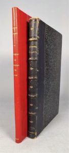PERRET (Emile). Recherches sur les armoiries placées au-dessus de la porte principale de l'hospice de l'Antiquaille. Lyon, Perrin, 1858. 4 ouvrages reliés en 1 volume grand in-8, demi-chagrin bleu marine, dos à nerfs (reliure de l'époque. Tiré à 200 ex. Les armoiries tirées en chromolithographie sont placées en frontispice. Reliés à la suite et du même auteur : Essais biographiques. Ferdinand Delamonce architecte à Lyon. Lyon, Vingtrinier, 1864 - Recherches historiques sur le château du Perron à Oullins. Lyon, Vingtrinier, 1868 - Greniers et fours publics en France. Recherches historiques sur ceux de la ville de Lyon. Lyon, Vingtrinier, 1869. Frottis au dos, Qq. rousseurs. Provenance : Bibliothèque Emile Salomon, héraldiste (ex-libris armorié). On joint du même : Recherches historiques sur l'ancienne boucherie de l'hôpital de Lyon. Lyon, Perrin, 1860. In-4°, demi-chagrin cerise, dos lisse, couv., non rogné (reliure moderne). Frontispice gravé. Provenance : Bibliothèque P. J. C. Orsi (ex-libris). Ensemble 2 volumes.