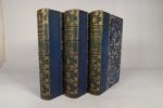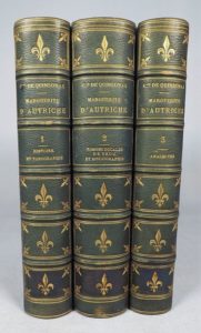 QUINSONAS (Comte E. de). Matériaux pour servir à l'histoire de Marguerite d'Autriche, Duchesse de Savoie, régente des Pays-Bas. Paris, Delaroque Frères, 1860. 3 volumes in-8, demi-maroquin bleu à coins, dos à nerfs ornés de fleurs de lys dorées, tranches dorées, couv. (reliure de l'époque). Tiré à 900 ex. Ouvrage vendu au profit des oeuvres de l'évêque de Belley. Chaque volume est orné d'une chromolithographie placée en frontispice et l'ensemble s'orne de nombreuses planches et fac-simile. L'un des quelques exemplaires où chaque tome est imprimé avec une encre rouge et 3 couleurs de papier (jaune, vert et parme). Menus défauts aux reliures.