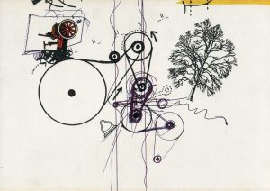 Jean Tinguely. "Meta". Berlin, Propylaën, 1972, 4°, 363 p., nombr. reproductions photographiques, rel. édit. d'après la maquette de Tinguely, sous forme de mallette de pleine toile grège illustrée en couleurs avec serrure, étui imprimé de carton souple. Texte en allemand. Véritable édition originale du livre-objet, un an avant l'édition française. Bien complet du disque 45 tours et du dessin original exécuté en collaboration avec "Meta-Matic n° 6", inséré entre les pages 80 et 81, signé au crayon par l'artiste. Importante monographie sur l'oeuvre de Tinguely et livre-objet original créé par l'artiste. Bel ex.