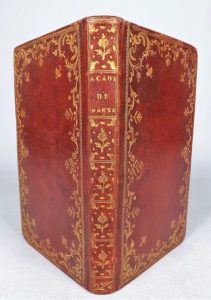 RECUEIL des pièces de poésie et d'éloquence présentées à l'Académie des Belles Lettres de Marseille pour le prix de l'année 1767 et pour ceux qui avaient été réservés les années précédentes. Marseille, Fr. Brebion, 1767. In-12 de 196 pages, maroquin grenat, large dentelle dorée sur les plats, tranches dorées (reliure de l'époque). Les premières pages renferment une histoire de la médecine suivie du régime de vivre des anciens marseillais. Bel exemplaire joliment relié en maroquin orné.