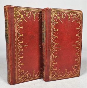 REGNIER. OEuvres. Genève, s.n. (Cazin), 1777. 2 volumes in-18, maroquin vieux rouge, large dentelle dorée encadrant les plats, dos lisse orné, tranches dorées (reliure de l'époque). Nouvelle édition considérablement augmentée, ornée d'un très curieux frontispice par Marillier. Exemplaire joliment relié.