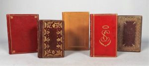 (Reliures). 5 volumes reliés en maroquin avec divers décors, tranches dorées. Nouvelles heures dédiées au duc de Bourgogne. P., Mequignon, 1754 - Dieu est l'amour le plus pur. Munich, 1806 - MASSILLON. Petit Carême. P., Du Bure, 1823 - Paroissien romain. P., Curmer, 1879 - Nouvelles heures de la cour. P., Saintin, 1801.