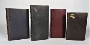 (Reliures). 4 volumes reliés en maroquin avec divers décors, tranches dorées. MARILLAC. Imitation de Jesus-Christ. P., Techener, 1860 (Hardy-Mennil) - Manuel des enfants de Marie. P., Chavillet, s.d. - Petit livre d'heures. P., Degodets, 1892 - Paroissien Elzevir. P., Gruel, 1889 (Kauffmann-Petit).