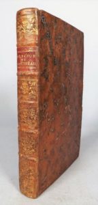 [ROUSSEAU (Jean-Jacques)]. Discours sur l'origine et les fondemens de l'inégalité parmi les hommes. Amsterdam, Rey, 1755. In-8 de [2]-70-[2]-262-[2] pages, basane brune, dos à nerfs orné, tranches rouges (reliure de l'époque). Rare édition originale ici en premier tirage et imprimée sur papier fort (Hollande ?). Elle est ornée d'un beau frontispice dessiné par Eisen et gravé par Sornique, d'une grande vignette sur le titre par S. Fokke et d'un fleuron armorié en tête de la dédicace signé S. F. (Fokke). Edition avec la dédicace signée "Jean Jaques " et la retouche du mot "conforme" corrigée à la plume (p. 11). Complet du feuillet d'errata avec l'avis au relieur au verso, mais sans les 3 cartons mentionnés. Épidermures sur les plats, mouillures et salissures claires en marge, condition très moyenne (Cohen, 519 - Tchemerzine V, 532).