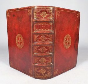 SAINT AUGUSTIN. Les confessions. Traduction nouvelle sur l'édition latine des pères bénédictins de la Congrégation de S. Maur. Avec des notes et de nouveaux sommaires des chapîtres. Paris, Jean Baptiste Coignard, 1686. In-8, maroquin rouge, plats armoriés, fleur de lis aux angles, dos à nerfs orné (reliure de l'époque). Édition originale de la traduction de Philippe Goibaud-Dubois, ornée d'un beau frontispice par J.B. Corneille. Ex libris manuscrit d'un couvent de Marseille. Exemplaire relié aux armes de la ville de Marseille. Provenance : Ab. Boyer de l'ordre de Malte. Jacques Vieillard (ex-libris).