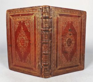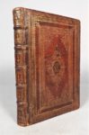 [SAINT FRANCOIS DE PAULE]. Rituale sacris ordinis minimorum Sancti Francisci de Paula. Paris, Séb. Cramoisy, 1643. In-8 de [2]-227-[4]-1bl. pages, maroquin rouge, plats richement ornés de plusieurs encadrements dorés avec au centre une large figure de forme losangée exécutée avec de petits fers filigranés déployés autour d'un ovale avec le mot « Charitas », dos à nerfs orné, tranches dorées (reliure de l'époque). Rituel à l'usage des minimes ; imprimé en rouge et noir, il s'ouvre par un beau portrait de Saint François gravé par Nic. Auroux et s'achève par une courte biographie de ce dernier par Antoine Muret. Gardes manquantes, quelques taches intérieures. Belle reliure ornée d'un cartouche central avec le mot « Charitas » écrit en lettres d'or, signe de l'ordre de minimes. Provenance : Bibliothèque de Bastide de la Pomme (ex-libris).