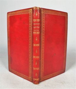 SAINT-RÉAL (l'Abbé de). Conjuration des espagnols contre Venise en 1618. Paris, s.n., 1781. In-16 maroquin vieux rouge, filets et chainette dorés sur les plats, doublures et gardes de tabis bleu ciel, roulette intérieure, dos lisse orné, tranches dorées (reliure de l'époque). Edition préfacée. Ouvrage dont Voltaire a comparé le style avec celui de Salluste. Frottis à une coiffe, plats légèrement tachés (Querard, 281). Provenance : Bibliothèque F.R.C.G (ex-libris avec la devise Leges Juraque Serva).