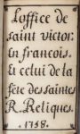 SAINT VICTOR. Officia propria venerabilis monasterii S. Victoris massiliensis. Marseille, Claude Garcin, 1673. In-12 de 184 pages, basane mouchetée, dos à nerfs orné (reliure de l'époque). Titre gravé daté de 1672. Edition revue et corrigée pour la première fois. On joint : Office Propre de Saint Victor et ses compagnons, martyrs de Marseille, patrons de l'église paroissiale de Saint Victor d'Orléans. Orléans, Ch. Jacob (1746). In-12, veau brun de l'époque. A la suite la traduction française manuscrite. Ensemble de 2 volumes.