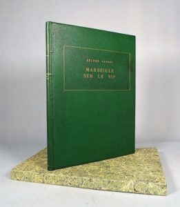 SAUREL (Hélène). Marseille sur le vif. Paris, Editions d'Art des Tablettes, 1925. Petit in-folio, chagrin vert bouteille, 1er plat orné du titre et de l'auteur en lettres dorées, dos lisse, couv. et dos, étui bordé (Adélaïde Brémond). Edition originale ornée de 15 gravures hors-texte dont 1 en deux teintes et 1 en camaïeu, et de nombreuses illustrations in-texte de L. R. Eller. Tirage à 370 exemplaires, celui-ci l'un des 150 sur bouffant Gothic, hors commerce. Bel état.