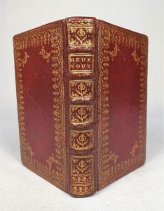 SENAULT (Elisabeth). Heures nouvelles dédiées à Monseigneur le Dauphin. Paris, de Hansy, s.d. (vers 1690) In-16, maroquin grenat, large dentelle dorée sur les plats, doublures et gardes de papier vert semé d'étoiles dorées, dos à nerfs orné, tranches dorées (reliure de l'époque). Charmant livre d'heures orné d'un frontispice représentant Saint Bruno d'après Champagne et de très nombreuses bordures, lettrines, en-têtes, fleurons et culs-de-lampe écrits et entièrement gravés en taille-douce par Elisabeth Senault, fille du célèbre graveur des Heures burinées. Bel exemplaire joliment relié, probablement par Derôme (petites lettres et chiffres à l'encre...).